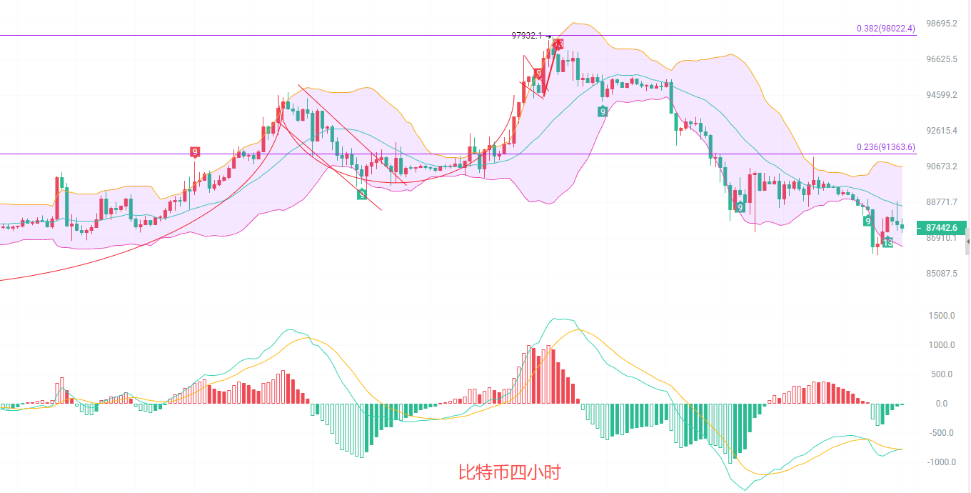 四小时K线出现反弹从布林带下轨85800反弹,在86000一线成型短线支撑,阻力位跟昨日一样不变,在黄金分割线0.786一线和EMA30和15交汇点9万关口,MACD连续缩量,DIF和DEA短期内进入两极分化的盘整行情,但是大趋势依旧是南下的趋势,思路上跟随趋势高位南下为主,北上的币友在88000附近可以离场了