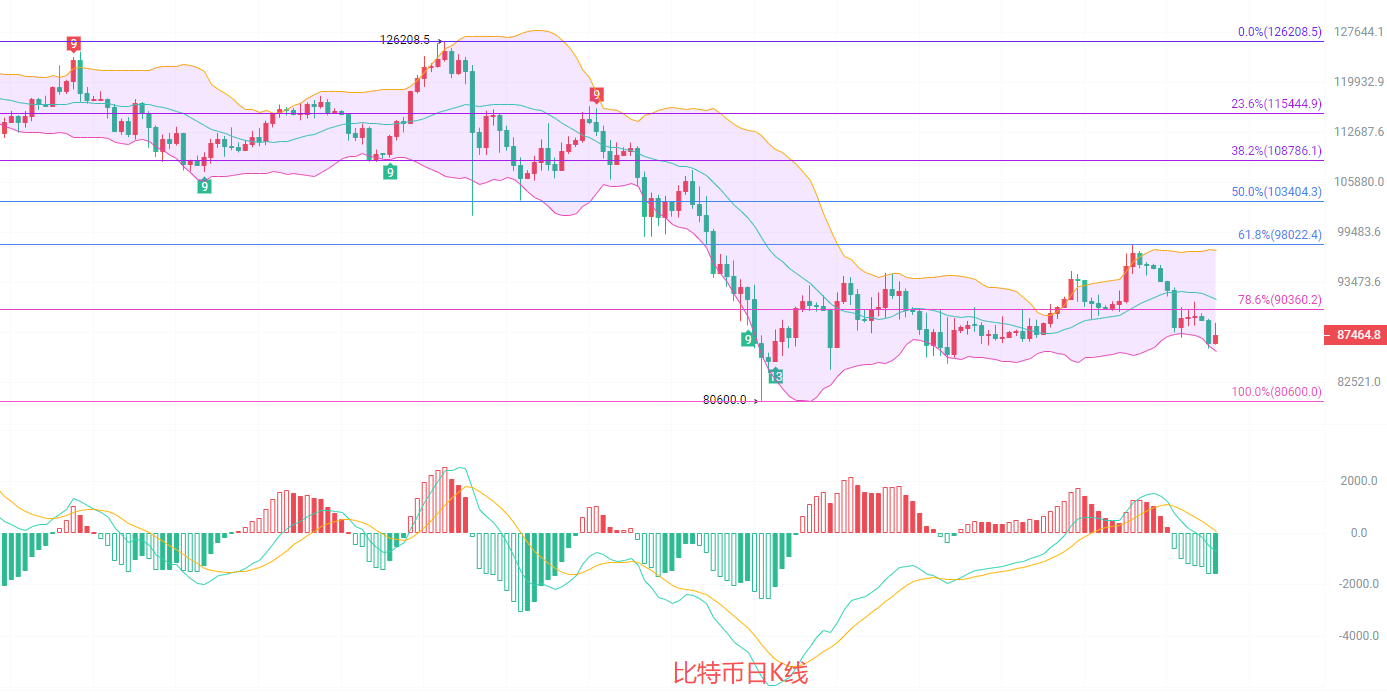 日K线发稿前最高88800,最低86460,这是典型的地步盘整收缩行情,出现回调就是南下的机会,EMA趋势指标空不变,MACD连续缩量,加上DIF和DEA跌到了0轴线下方,目前在能量指标内所以横盘是常态,等待冲破以后南下继续,K线探底布林带下轨86000以后出现回调,中轨关注91500,整体趋势上看主力有可能回调试探9万的压强,这就是南下的机会