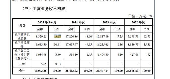 分产品看,公司主要产品之一即机床辅助机械装备,毛利率从2022年的25.82%降至2025年上半年的15.50%。公司称,主要系该产品定制化特点突出,不同型号之间毛利率水平差异较大,且报告期内相关产品市场竞争逐步加剧,公司通过商业策略调整以巩固市场份额。