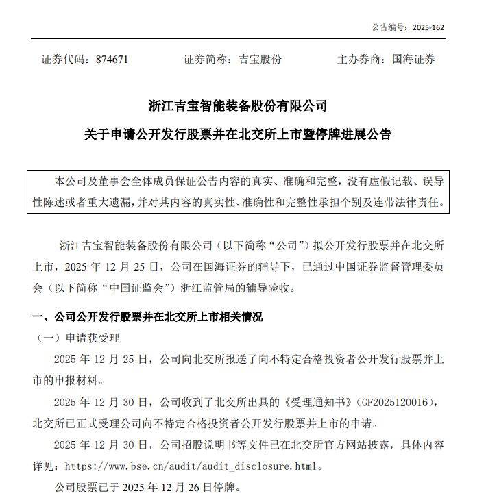 在这样的背景下,2025年12月25日,吉宝股份“踩线”向北交所报送了上市申报材料,并于12月30日获得了北交所的受理。