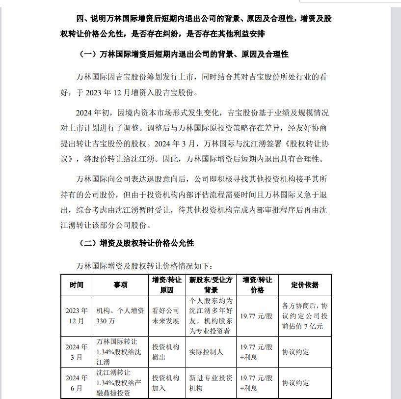 短短数月即2024年初,万林国际便打算退股。对于万林国际的“闪进闪退”,2024年11月,吉宝股份新三板挂牌期间回复监管部门问询函称,2024年初,因境内资本市场形势发生变化,吉宝股份基于业绩及规模情况对上市计划进行了调整。调整后与万林国际原投资策略存在差异,经友好协商提出转让吉宝股份的股权。