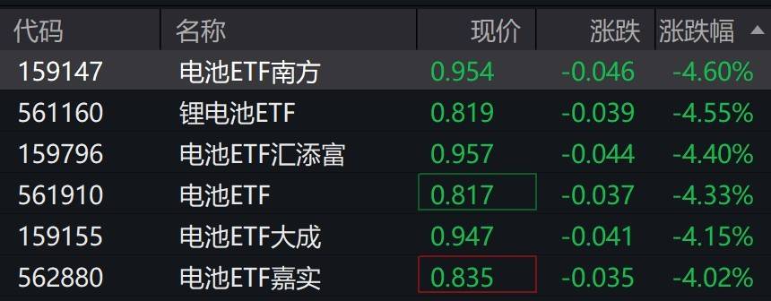 电池概念股走低,天赐材料跌超8%,多氟多跌超7%,先导智能、国轩高科跌超5%。