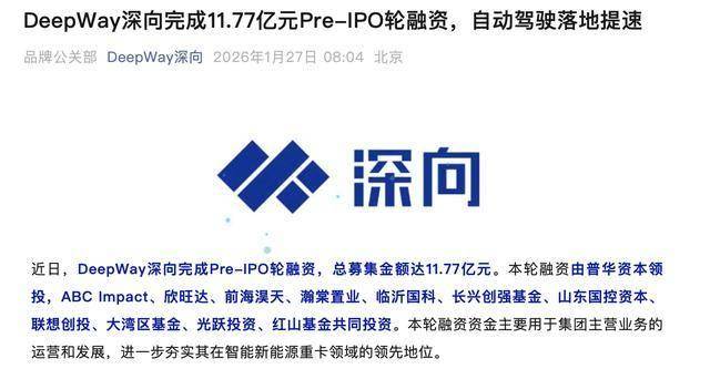 瑞财经 吴文婷1月27日,DeepWay深向(深向科技)宣布完成Pre-IPO轮融资,总募集金额达11.77亿元。