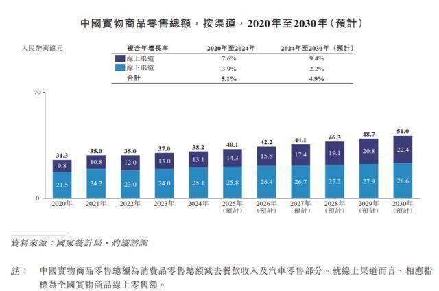 未来,预计2030年中国实物商品零售总额将进一步增长至51.0万亿元,2024年至2030年的复合年增长率约为4.9%。同期内线上渠道有望增长至22.4万亿元,复合年增长率为9.4%;线下渠道预期将增长至28.6万亿元,复合年增长率为2.2%。