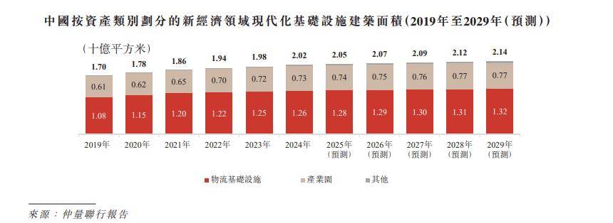 根据仲量联行报告,中国新经济领域现代化基础设施市场持续扩容,2024年底总建筑面积达20.2亿平方米,预计2029年底将增至21.4亿平方米。其中,物流基础设施占比62.6%,2019-2024年年均复合增长率3.2%,而高标仓作为高端细分领域,同期年复合增长率达17.1%,2024年渗透率13.5%,未来增长潜力广阔。