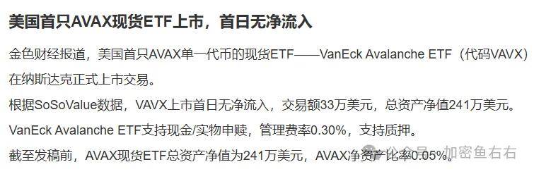 美首只AVAX现货ETF上市首日零流入,资金都去黄金白银了,连BTC、ETH的现货ETF都是净流出,没人买也不奇怪。