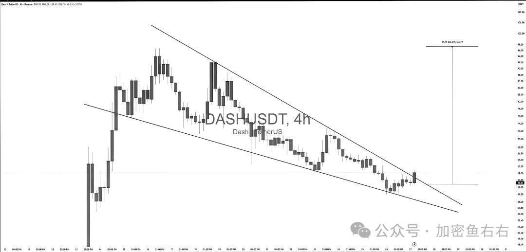 DASH即将触发第五次日线超卖信号, 4 小时级别尝试突破下降楔形。如果向上突破并伴有动量蜡烛图,我们可能会看到 60-70% 的大幅上涨行情。