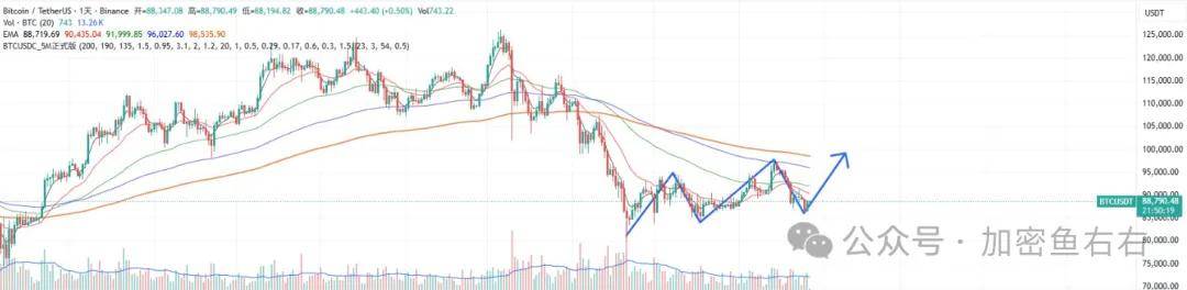 3)日线支撑位83700下方是优质支撑,高低点也在不断抬高,只要不跌破83700,未来几周有机会走出反弹第五浪。