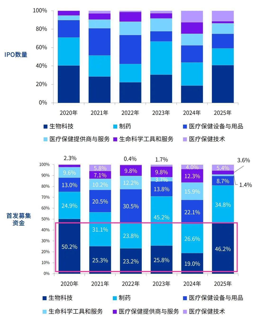 生物科技始终是中国生命科学领域IPO的核心力量,2025年共有18家生物科技企业成功上市,首发募集资金占全行业总额的46%以上,重夺主导地位。2021年至2024年期间,制药企业因多个创新药管线进入商业化关键阶段,首发募集资金规模一度反超生物科技,市场对国产创新药商业化前景的预期持续升温。在此期间,包括医疗器械、医疗技术与医疗服务在内的各细分领域IPO数量均显著收缩,融资活动整体趋缓。至2025年,随着海外BD交易活跃、临床进展兑现及港股18A机制持续赋能,生物科技与制药企业再度成为资本市场焦点。