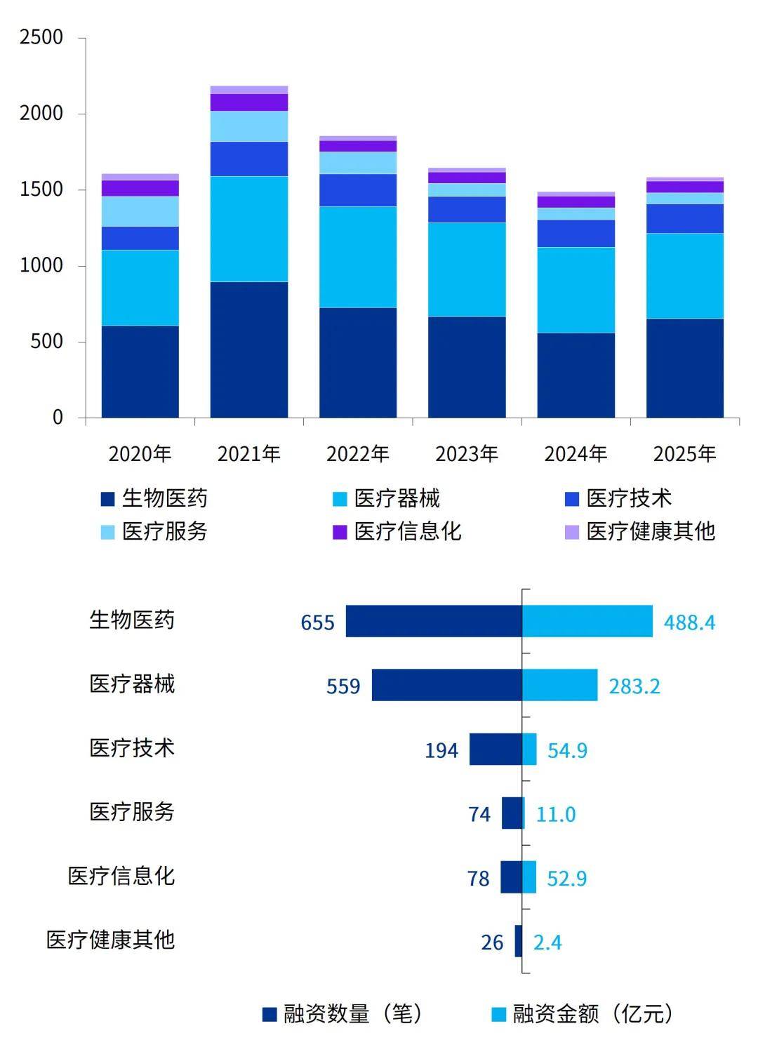 2025年,生物医药仍是医疗健康领域最核心的融资引擎,交易数量占全赛道41%,金额占比达55%,稳居“吸金半壁”。但单笔融资均值较2021年峰值下降57%,显示资本趋于理性,大额资金更集中于具备“后期研发管线+海外BD授权”双重标签的项目。