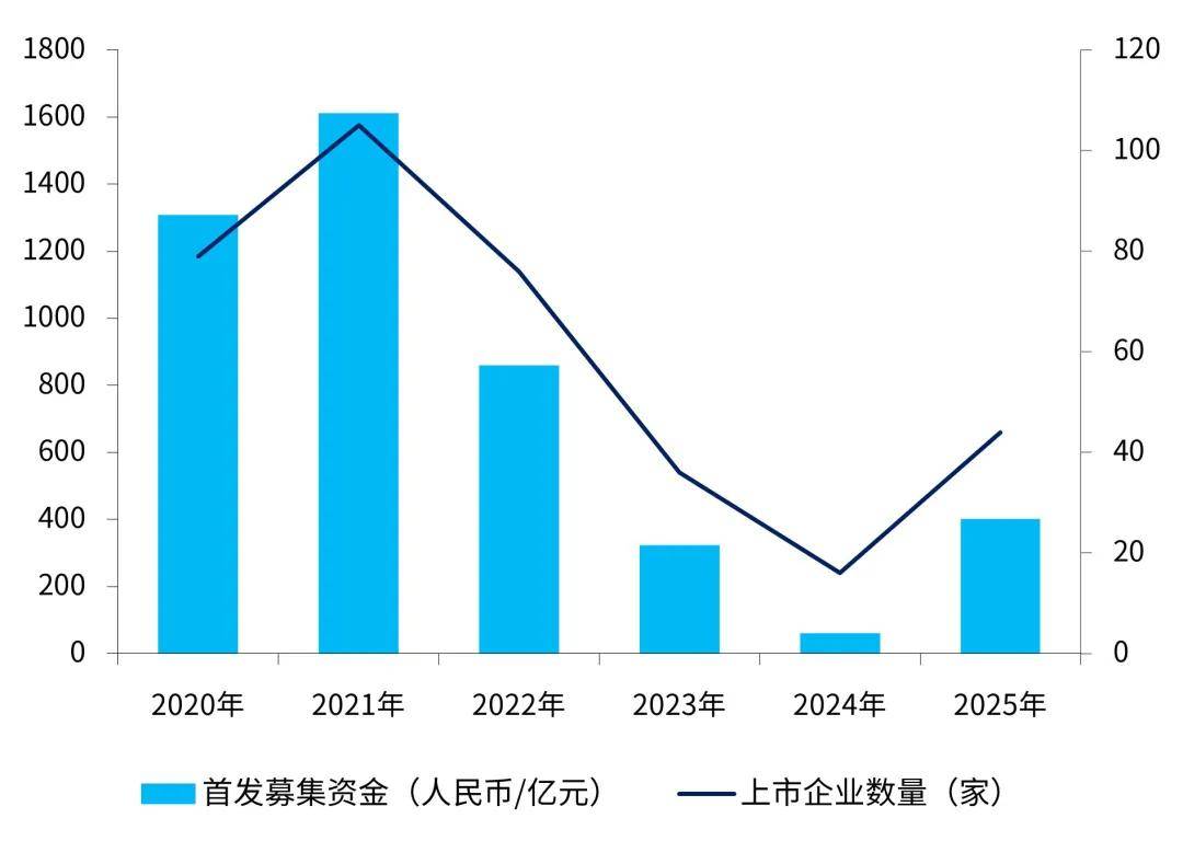 2020年至2021年为中国生命科学和医疗健康领域IPO的高峰期,2021年单年IPO数量突破百家,创下近年峰值。此后,受市场环境与监管政策调整影响,IPO数量自2022年起持续下行,至2024年仍处于低位。2025年,市场信心显著修复,IPO活动迎来强劲反弹,全年A股、港股及美股中资股合计实现44家新上市,同比增长175%;首发募集资金规模突破400亿元人民币,同比增长557.7%,回升至2023年水平,标志着中国生命科学和医疗健康板块在资本市场的融资功能逐步恢复。