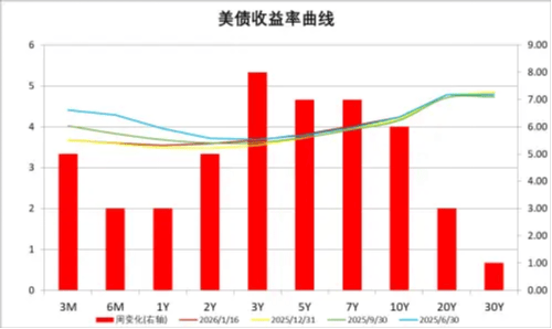 上周,国内发布12月进出口及社融数据。其中,出口金额同比由11月的5.9%进一步上行至6.6%,显示我国出口维持较强韧性。社融数据方面,虽然总量有所走弱,但人民币贷款同比增速维持6.3%,出现了一定的企稳迹象。往后看,近期中美贸易摩擦有所缓和,但逆全球化趋势仍在持续。内需方面,随着地产政策继续放松,同时生育补贴有所加码,对经济增速能够形成一定支撑,海外不确定性较大背景下经济基本面预计将出现一定的震荡回升。海外方面,12月CPI同比增长2.7%,增速与11月持平,继续维持温和回落状态。降息预期方面,CPI走平背景下降息预期变化不大,目前中性预期26年1月降息的概率维持4%。
