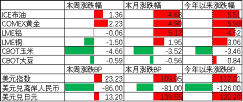 上周各类期货价格有所震荡,其中黄金涨幅最大,玉米跌幅最大。ICE布油收于64.2美元,涨1.36%,COMEX黄金收于4601.1美元,涨1.36%。
