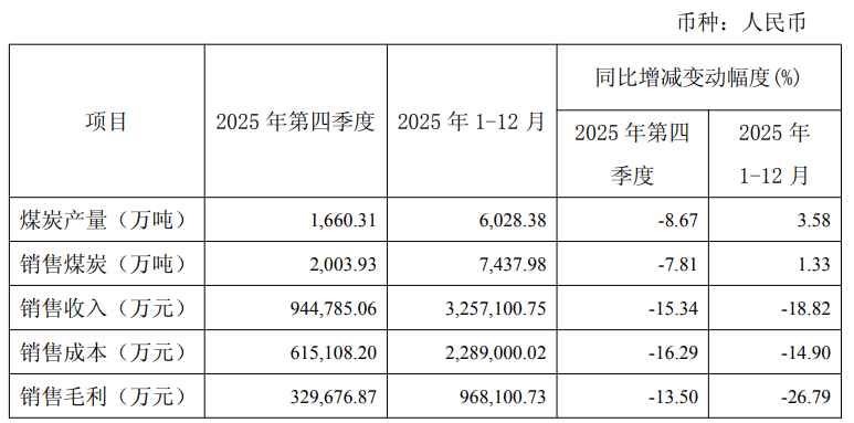 1月21日,伊泰B股(900948)发布公告,公司的2025年第四季度经营情况显示,煤炭产量为1660万吨,同比减少8.67%;销售煤炭为2004万吨,同比减少7.81%。销售收入为94.48亿元,同比减少15.34%;销售成本为61.51亿元,同比减少16.29%。销售毛利为32.97亿元,同比减少13.5%。