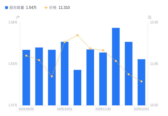 日期A股户数(户)流通A股户均持股数(股)户均持股市值(万元)2025-12-311536820594.4423.292025-12-201562020262.1823.402025-12-101582320002.2324.002025-11-301546520465.2625.302025-11-201551020405.8925.342025-11-101521420802.9026.772025-10-311562120260.8925.612025-10-201550520412.4723.432025-10-101553820369.1124.502025-09-301550420413.7824.86