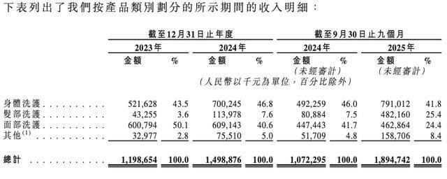 作为压舱石的身体洗护品类,2023-2025年前三季度分别实现营收 5.22亿元、7亿元、7.91亿元,占比始终稳定在40%以上,分别为 43.5%、46.8%、41.8%,