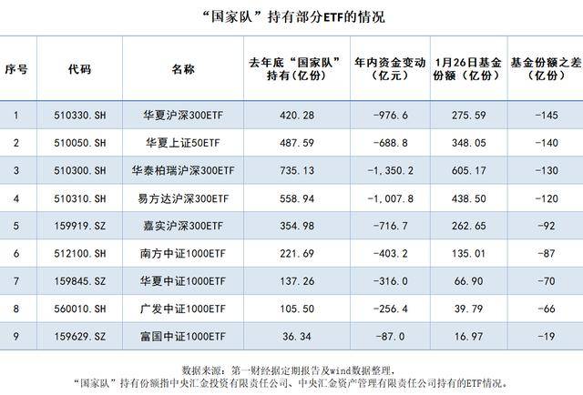 以目前规模最大的华泰柏瑞沪深300ETF为例,根据该基金定期报告,截至2025年底,“国家队”合计持有约735.13亿份,而1月26日时,该产品的基金份额为605.17亿份。简单计算可知,“国家队”年初以来至少减持了近130亿份,按照该产品的年内成交均价粗略计算,减仓金额达到621.86亿元。