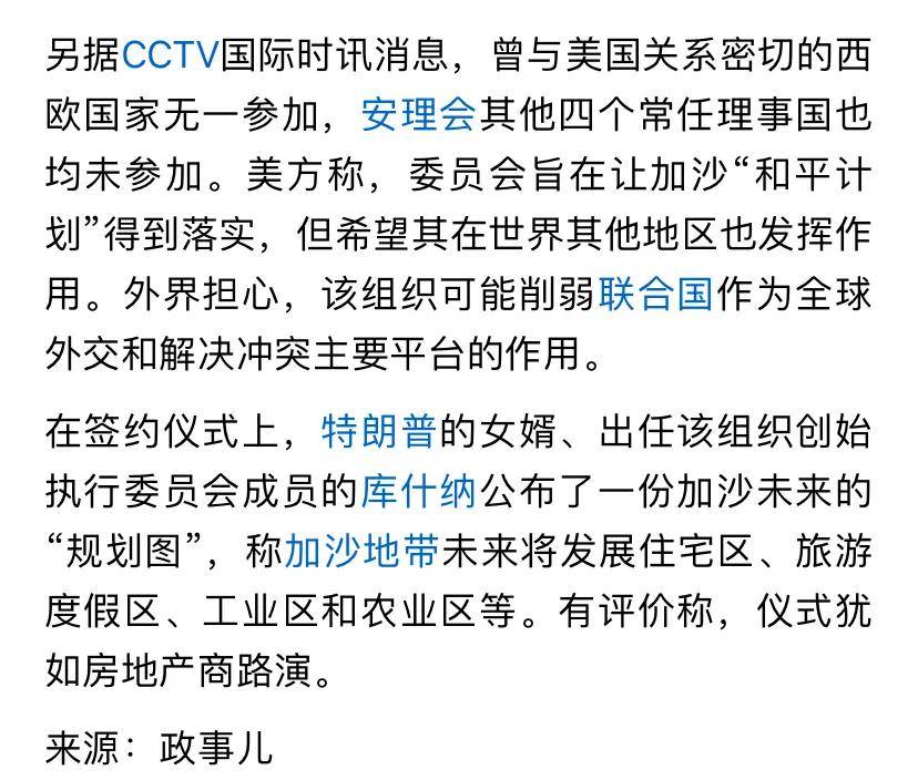 至于那些没有加入的国家,其中包括中国、俄罗斯、日本、法国、德国、以色列、意大利、荷兰、波兰、西班牙等多个重要国家。尤其令人注意的是,西欧国家几乎全都没有参与其中,这不禁让人感到有些意外。究竟这些国家未来是否会做出改变,目前尚难预测。然而,可以肯定的是,联合国依然是世界大多数国家的信任之源和依赖所在。至于美国所谓的加沙地带和平委员会,或许不过是美国为自己编织的一张宏大蓝图,至于其中是否能带来真正的和平,我们暂且拭目以待。 综合来看,参与和平委员会的国家并不算多,而这份名单本身也似乎有些不够代表性。仔细分析,不难发现,这个所谓的和平委员会更像是一个由商业帝国新成立的股份公司,而非真正意义上的国际和平组织。至此,我们可以说,这场由美国主导的和平委员会,本质上可能更多的是一个充满商业利益和政治算计的项目,而非旨在真正推动全球和平的机构。