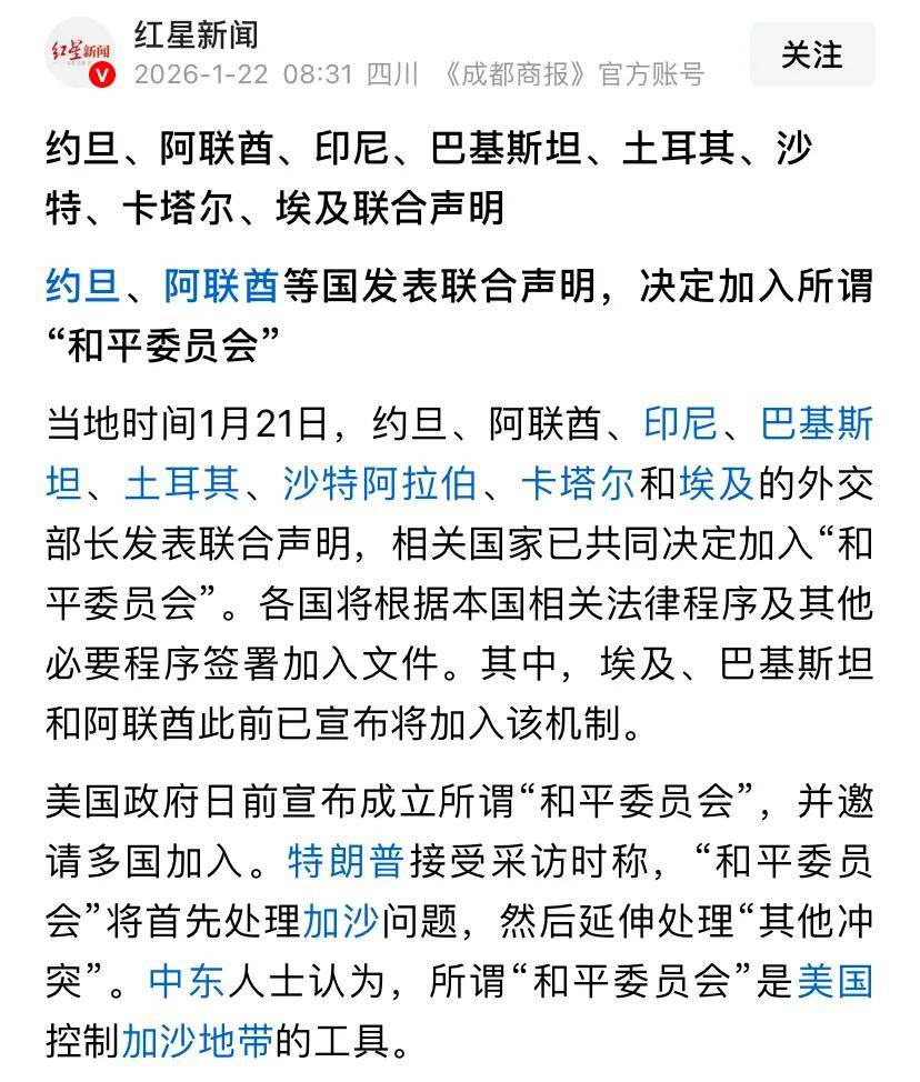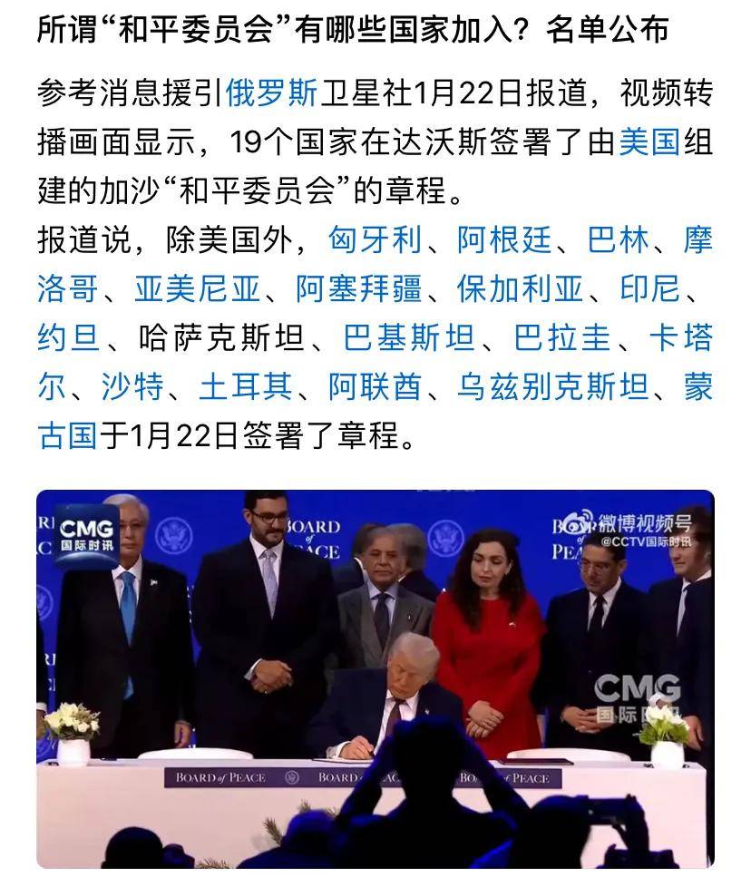 最近,关于和平委员会的话题引起了广泛关注。美国曾向我国发出了加入邀请,但我国最终没有选择加入,并且相关部门明确表示,坚定支持以联合国为核心的国际体系。这一表态也间接表明,我国不参与该和平委员会的计划。虽然如此,我国的拒绝并不意味着其他国家就会跟随,毕竟,每个国家都有自己的判断和立场。那些选择加入的国家有其深层次的考量,而选择不加入的同样有各自的理由。放眼看去,或许这不过是一个复杂的政治局面,加入与否的决定看似重要,实则只是选择自己应有的道路,无需过多解读。毕竟,正如我们常说的,顺其自然才是最理智的态度。根据媒体2026年1月22日的报道,已经有19个国家在达沃斯签署了由美国主导的加沙和平委员会章程,正式宣布加入该委员会。