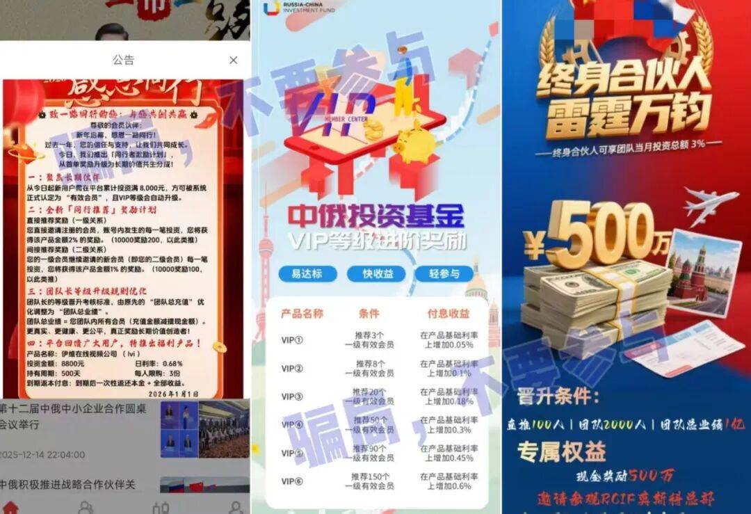 蹭“中俄贸易”的热点,虚构国家背景,用超高收益理财产品诱人入场。