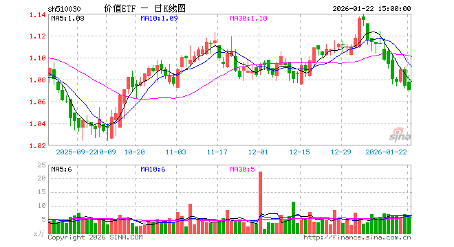 1月22日,价值ETF(510030)跌0.37%,成交额731.21万元。当日份额增加50.00万份,最新份额为1.52亿份,近20个交易日份额减少1250.00万份。最新资产净值计算值为1.63亿元。