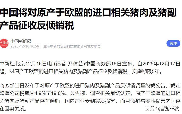 自2025年12月17日起,对原产于欧盟的进口相关猪肉及猪副产品征收反倾销税,实施期限5年,这叫“对等反击”。