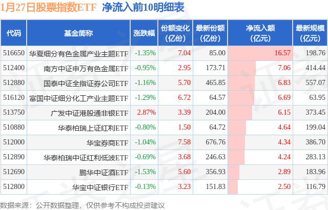 当日有221只股票指数ETF基金出现资金净流入,其中净流入排首位的是华夏细分有色金属产业主题ETF(516650),份额增加了7.04亿份,净流入额为16.57亿元。