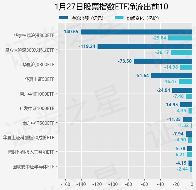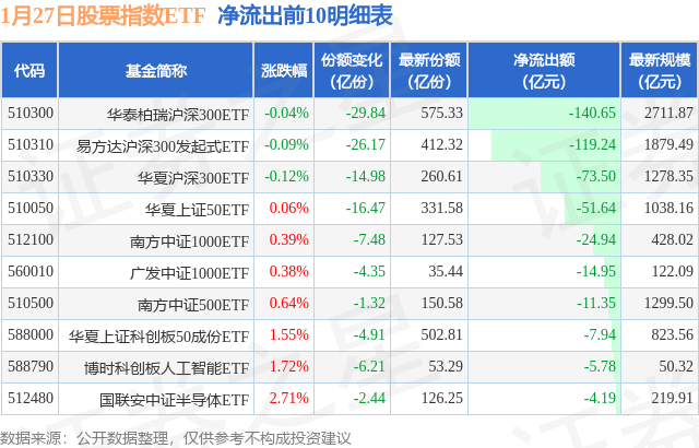 当日有231只股票指数ETF基金出现资金净流出,其中净流出排首位的是华泰柏瑞沪深300ETF(510300),份额减少了29.84亿份,净流出额为140.65亿元。