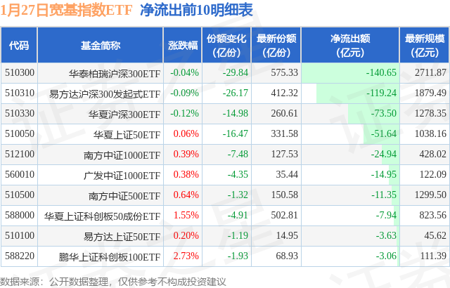 当日有67只宽基指数ETF基金出现资金净流出,其中净流出排首位的是华泰柏瑞沪深300ETF(510300),份额减少了29.84亿份,净流出额为140.65亿元。