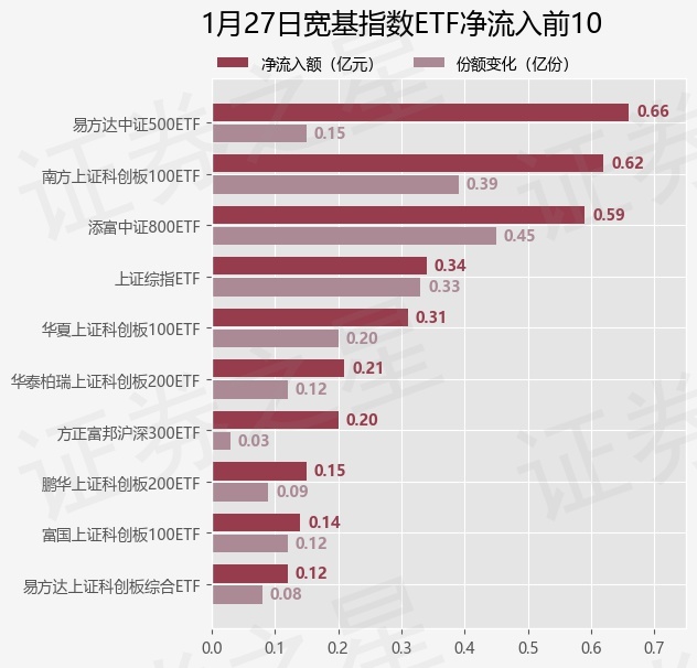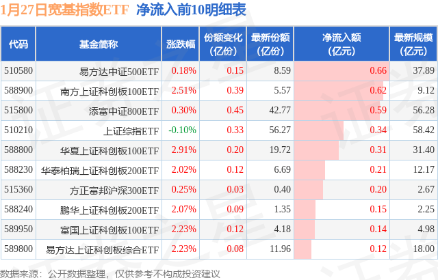 当日有33只宽基指数ETF基金出现资金净流入,其中净流入排首位的是易方达中证500ETF(510580),份额增加了1520.0万份,净流入额为6613.24万元。