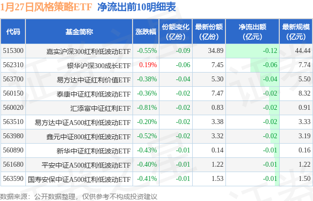 当日有11只风格策略ETF基金出现资金净流出,其中净流出排首位的是嘉实沪深300红利低波动ETF(515300),份额减少了900.0万份,净流出额为1152.77万元。