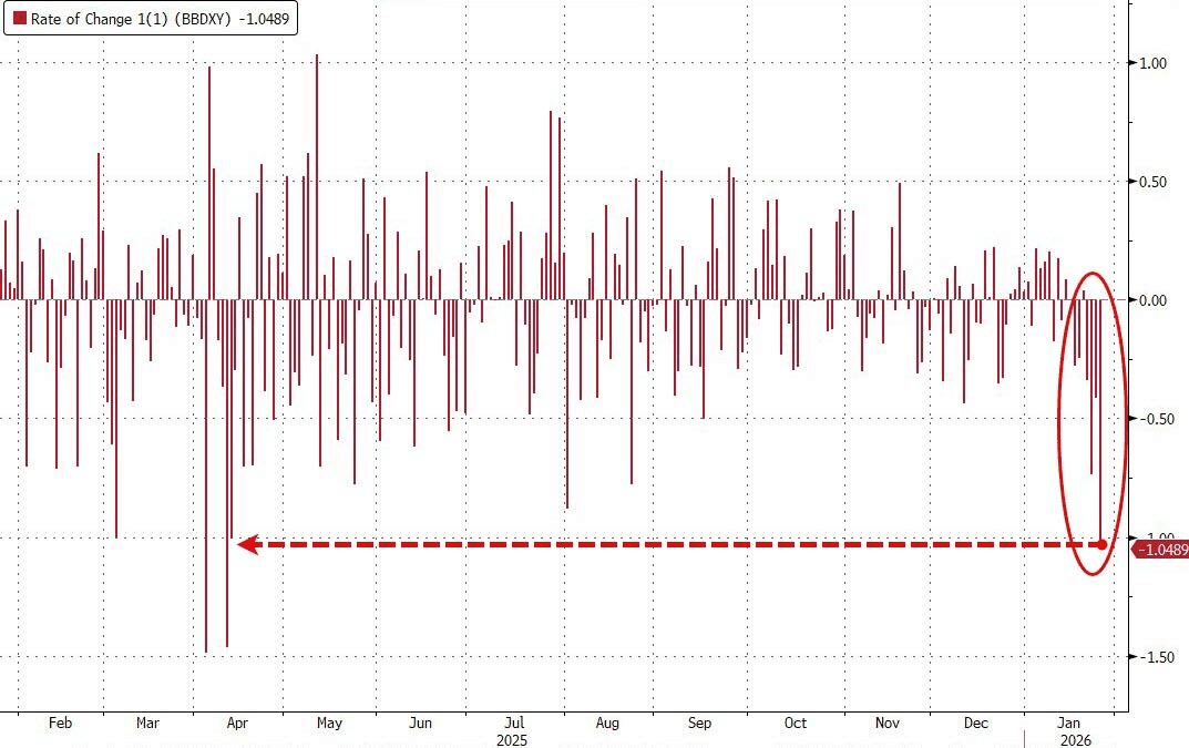 美元正遭遇近四年来最严重的抛售潮,交易员押注美元将进一步走弱。彭博美元即期指数出现自去年4月宣布全面关税以来最陡峭的四日跌幅,投资者为对冲更深度抛售支付的成本已创历史新高。