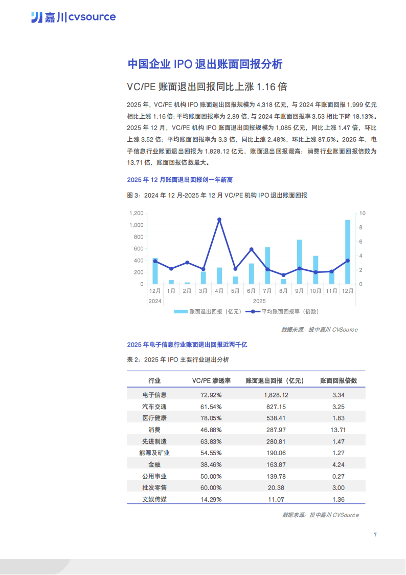 行业方面,电子信息行业IPO数量48家居首,能源及矿业行业募资金额784.38亿元领先,半导体领域22家企业上市,产业成熟度较高。VC/PE机构IPO渗透率达57.82%,12月渗透率创年内新高80%;红杉中国参投16家企业上市,战绩位列行业第一,VC/PE机构账面退出回报4318亿元,同比上涨1.16倍,电子信息行业账面退出回报1828.12亿元最高,消费行业账面回报倍数13.71倍最大。