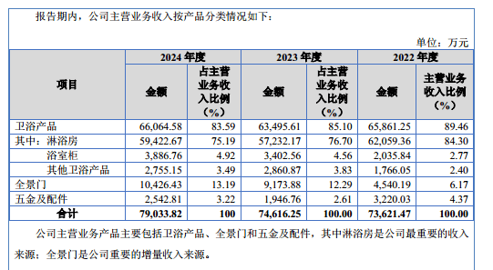 而卫浴产品又主要由淋浴房、浴室柜、其他卫浴产品构成,其中淋浴房产生的销售收入分别为62059.36万元、57232.17万元、59422.67万元,分别占当期主营业务收入的84.3%、76.7%、75.19%,是公司最核心的营收来源。
