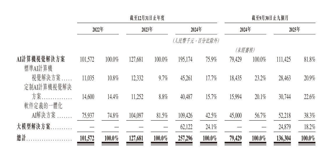 业务收入结构上,2023年的收入全部来自AI计算机视觉解决方案,其中软件定义一体化AI解决方案占比81.5%;2024年AI计算机视觉解决方案收入占比降至75.9%,其中软件定义一体化AI解决方案占比降至42.5%,大模型解决方案当年推出后占总营收的24.1%。2025年前三季度,大模型解决方案收入占比进一步升至18.2%。