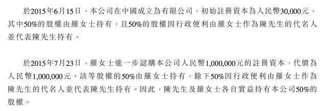 2015年7月,罗韵进一步认购公司100万元的注册资本,代价为100万元。该等股权的50%由罗韵持有,余下50%因行政便利由罗韵作为陈振杰的代名人并代表陈振杰持有。