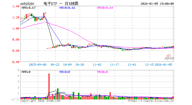 1月5日,电子ETF(515260)涨3.81%,成交额3100.91万元。当日份额减少1600.00万份,最新份额为8.79亿份,近20个交易日份额减少5000.00万份。最新资产净值计算值为5.99亿元。