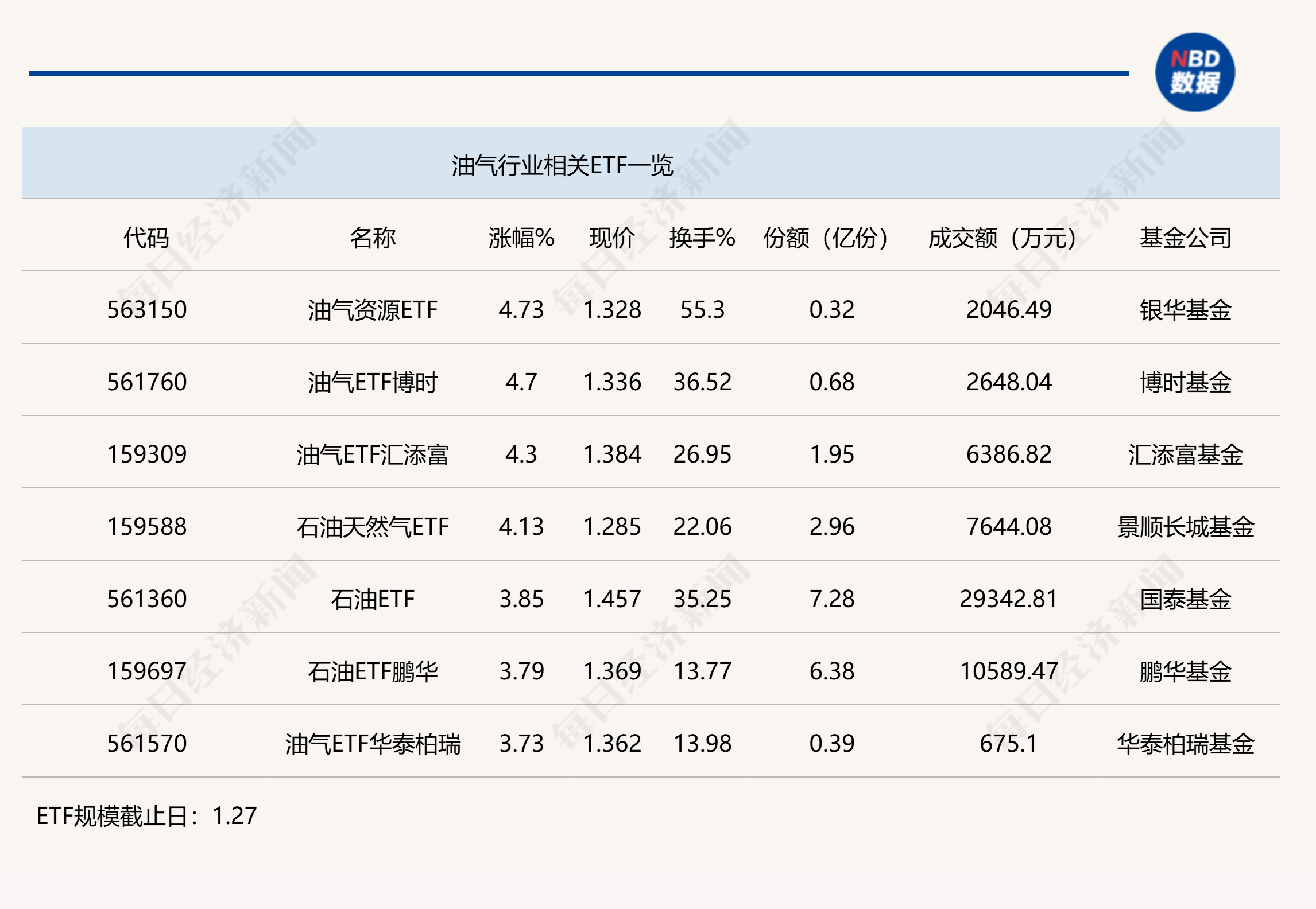 点评:石油ETF(561360)今日上午大涨3.85%,该ETF份额为7.28亿份,半日成交金额达到2.93亿元,交投相对活跃,该ETF追踪的是中证油气产业指数。