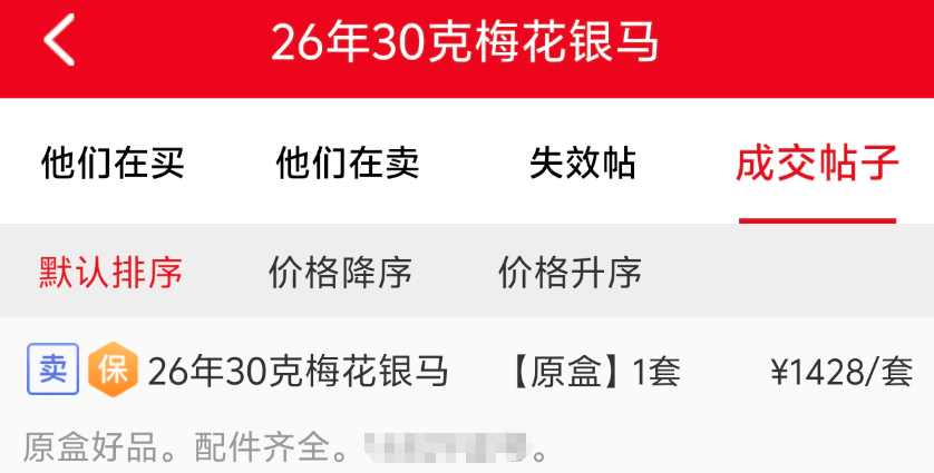 发行价745元的30克梅花银币,最新成交价达到1428元!