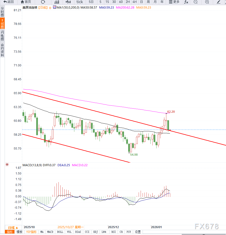 关键支撑位集中在58.80—59.00美元区域,该位置为前期平台与60日均线交汇处,若有效跌破,下一目标可能指向56.50美元;上方阻力则位于60..0美元与62.00美元。整体来看,日线级别已转为震荡偏空结构,短期反弹更可能被视为修复性行情。