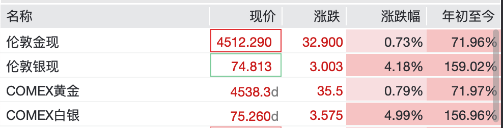 黄金白银,再度迎来爆发。12月26日,国际贵金属全线走强,现货黄金涨势延续,将历史新高刷新至4526美元/盎司,日内涨超1%;现货白银再刷历史新高,盘中最高触及75美元/盎司,年内涨幅近160%,成为今年涨幅最高的贵金属品种;现货铂金同样强势,涨超8%,一度触及每盎司2413.62美元的纪录高位。