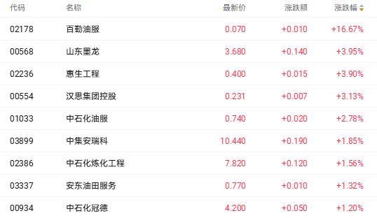 财联社1月9日讯(编辑 胡家荣)今日港股油气设备股延续近期涨势。截至发稿,百勤油服(02178.HK)涨16.67%、山东墨龙(00568.HK)涨3.95%、中石化油服(01033.HK)涨2.78%。