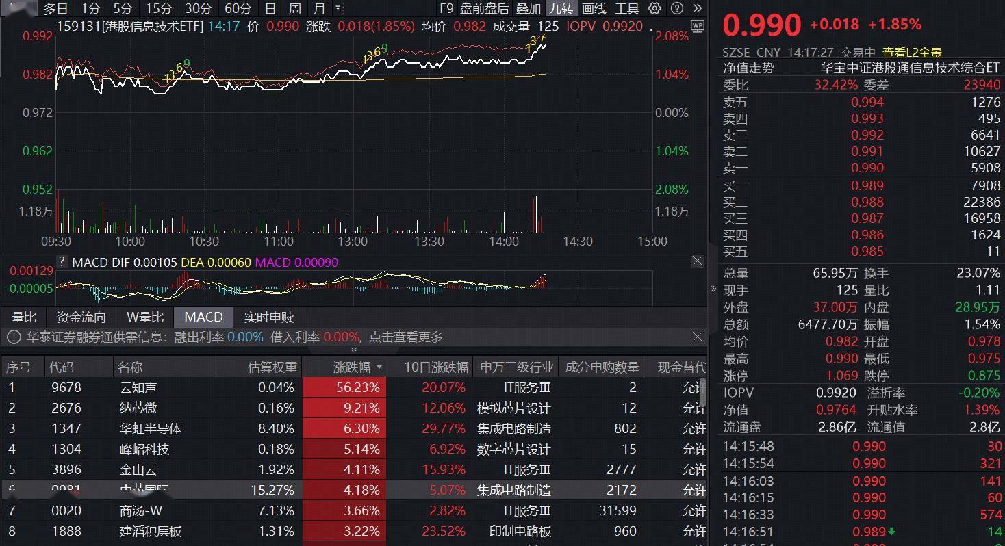 1月28日午后,港股硬科技再度拉升走强,云知声暴涨56%,纳芯微涨超9%,华虹半导体涨超6%,中芯国际涨超4%。全市场首只聚焦“港股芯片”产业链的港股信息技术ETF(159131)场内价格现涨1.85%,实时成交额超6477万元。