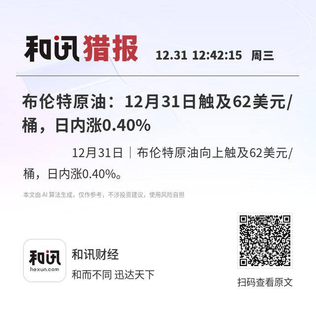 12月31日|布伦特原油向上触及62美元/桶,日内涨0.40%。