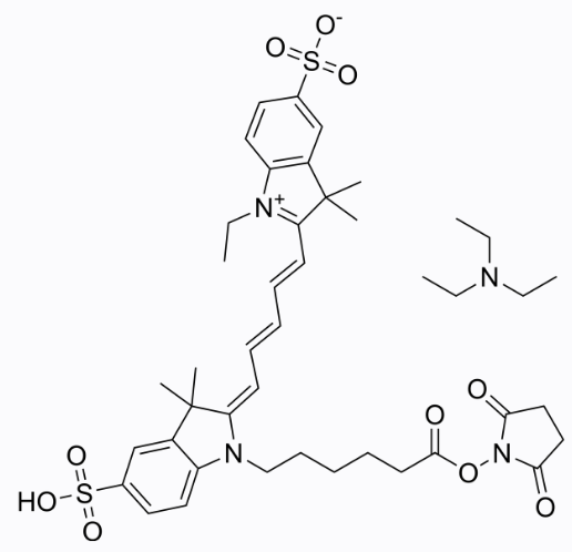 Cy5-SE (Cy5 NHS Ester) triethylamine salt 一种用于标记肽, 蛋白质, 寡核苷酸的氨基基团的反应染料 (Ex=649 nm; Em=670 nm)。