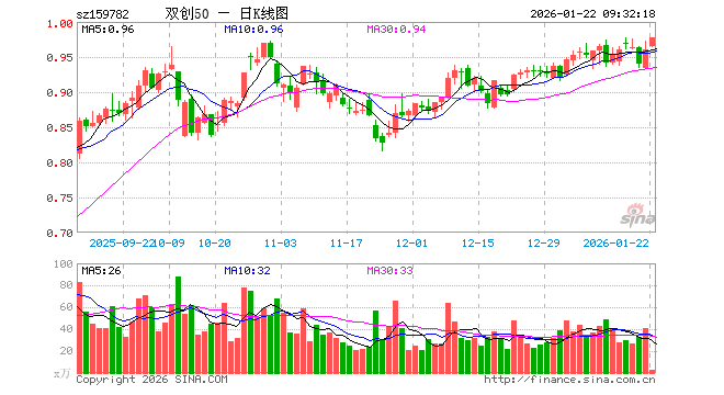 1月22日,双创50ETF(159782)开盘涨0.52%,报0.965元。双创50ETF(159782)重仓股方面,中际旭创开盘涨1.41%,新易盛涨0.12%,宁德时代涨0.35%,寒武纪跌0.73%,阳光电源涨0.49%,中芯国际涨1.41%,海光信息涨4.82%,胜宏科技涨1.31%,汇川技术涨0.65%,澜起科技涨8.03%。