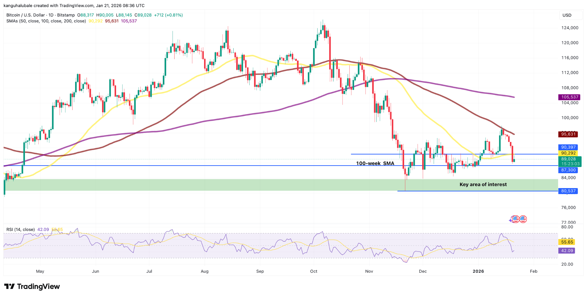 撰稿时,BTC/USD交投于8.9万美元,下一道支撑位在8.73万美元,该价位也为100周SMA(简单移动平均线)。