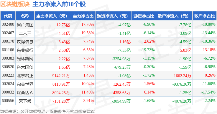 从资金流向上来看,当日区块链板块主力资金净流出57.43亿元,游资资金净流入1.67亿元,散户资金净流入55.76亿元。区块链板块个股资金流向见下表: