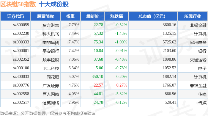 证券之星消息,1月28日,区块链50(399286)指数报收于4284.36点,跌0.77%,成交772.54亿元,换手率3.94%。当日该指数成份股中,上涨的有12家,省广集团以4.9%的涨幅领涨,下跌的有38家,视觉中国以7.03%的跌幅领跌。