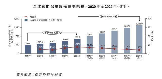 近年来,全球智能配电设备行业保持稳定增长,从2020年的约3,500亿元增至2024年的约6,000亿元,期内复合年增长率约为14.4%。在新能源的快速部署及电网布局、海外市场的加速发展、电网结构的持续优化及电网建设数字化,以及智能化需求日益增长的推动下,预计到2029年全球智能配电设备行业的市场规模将达到约11,460亿元,2024年至2029年的复合年增长率约为13.8%。